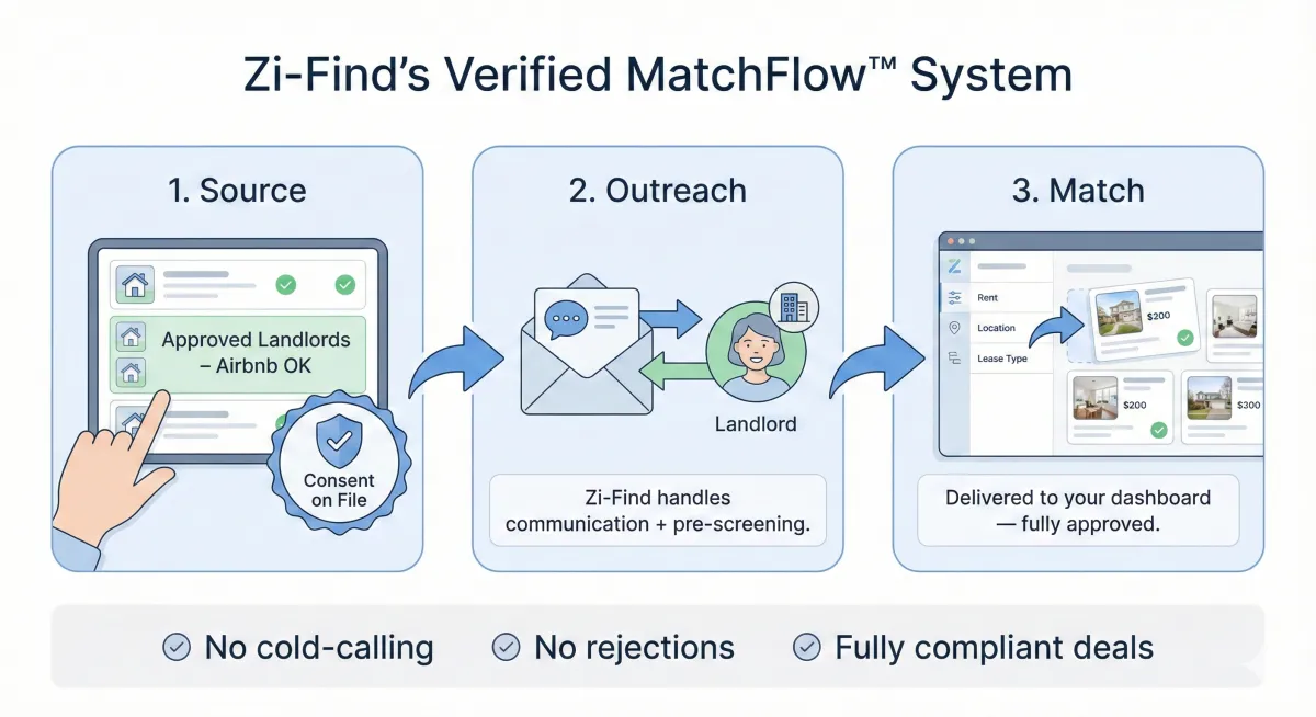 Most rental arbitrage sourcing methods rely on cold outreach, manual scraping, or praying a landlord says “yes.” Zi-Find was built differently. Its Verified Landlord Flow connects you directly to owners who already approve of subleasing for short-term rentals, no pitching, no guessing, and no rejection.